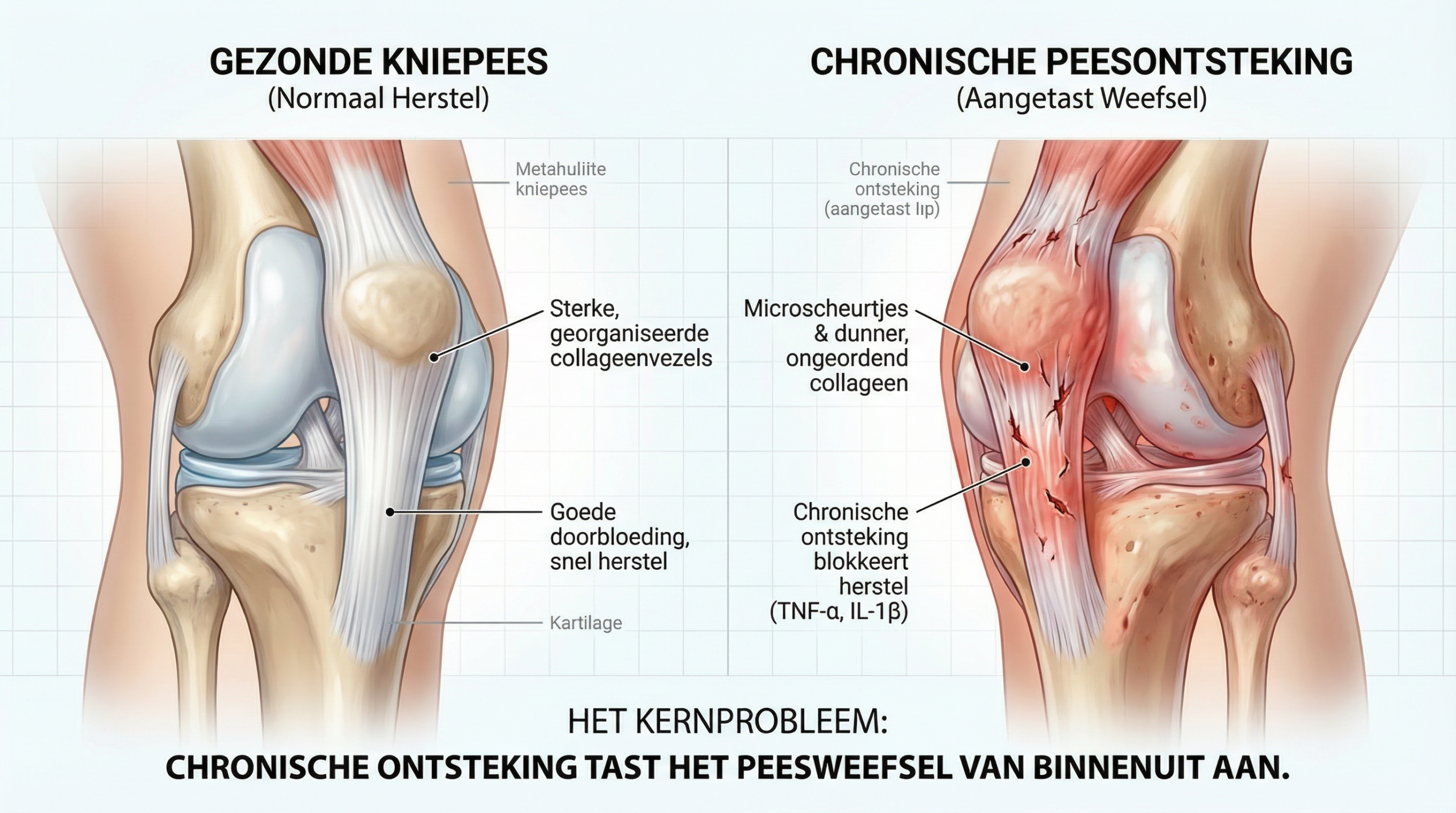 Maar wist je dat chronische ontsteking in het kniepees weefsel een even beslissende rol speelt als de overbelasting zelf?