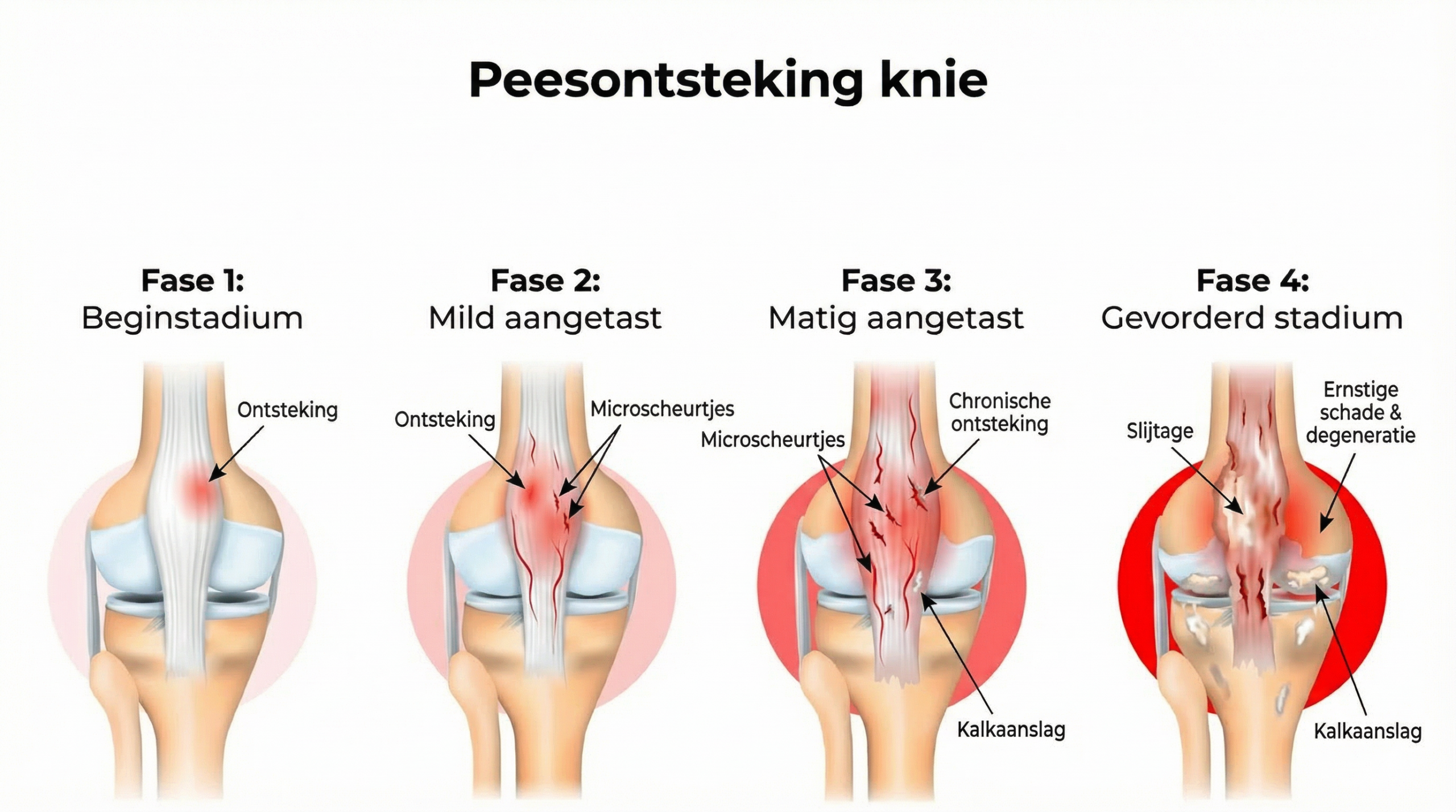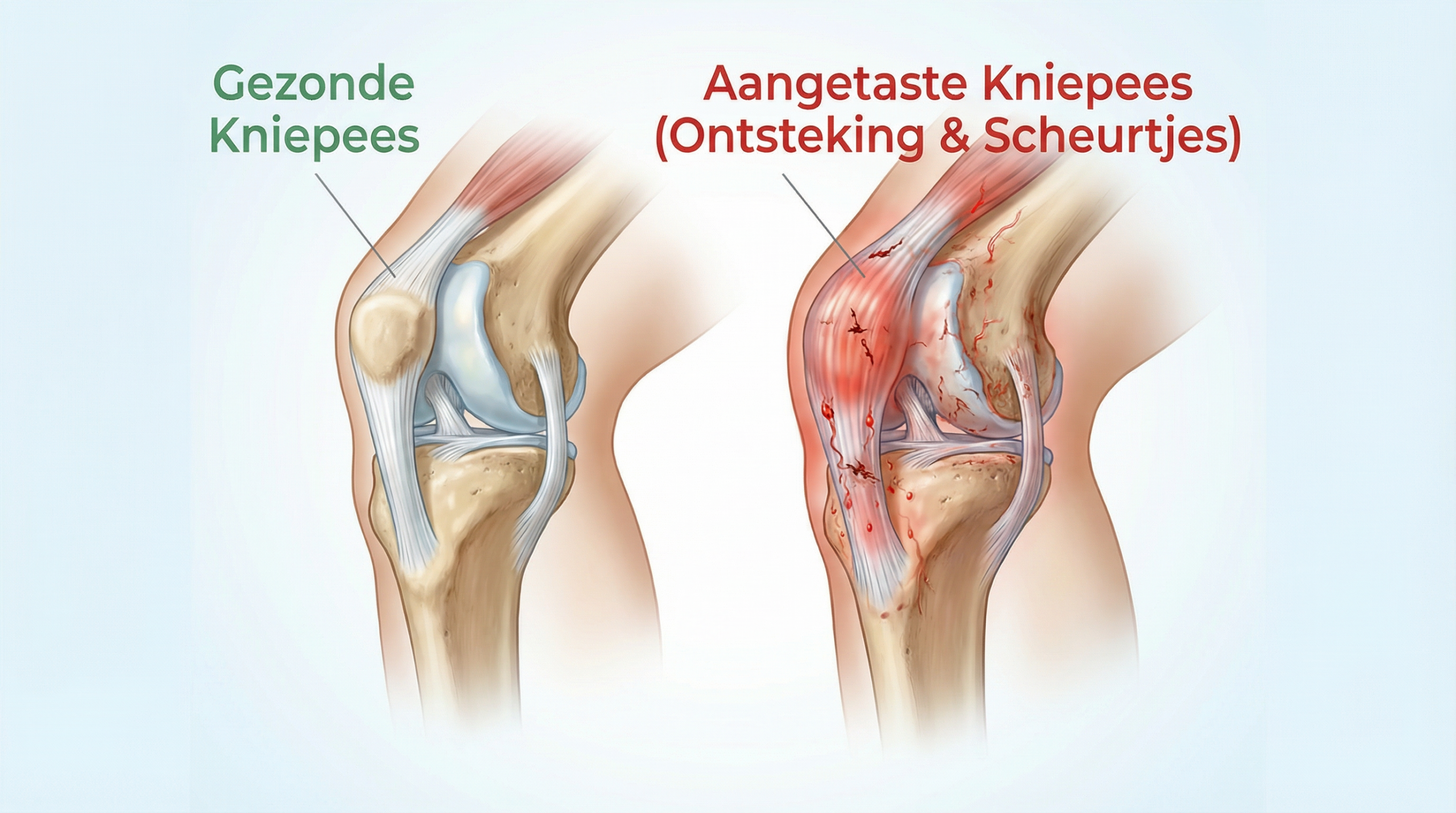 Wanneer dit gebeurt, blijft de ontsteking in de kniepees actief en neemt de structurele beschadiging toe — wat leidt tot steeds meer pijn bij elke kniebeweging.
