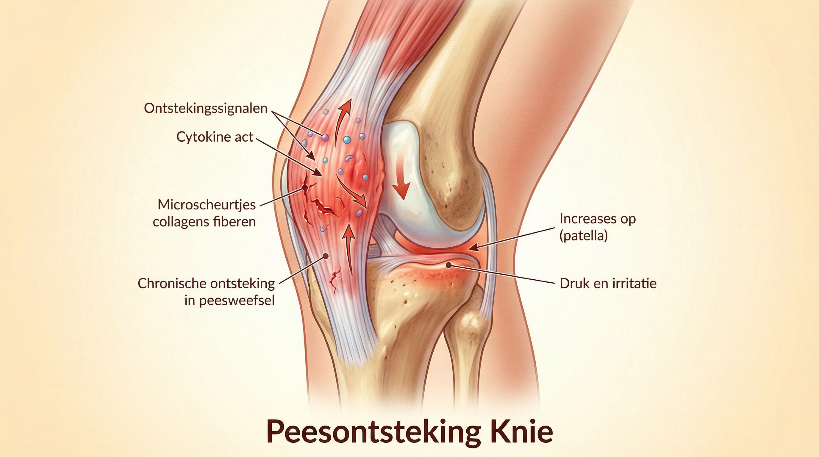 Wanneer de kniepees herhaaldelijk wordt belast, activeren microscheurtjes pro-inflammatoire cytokinen zoals TNF-α en IL-1β.