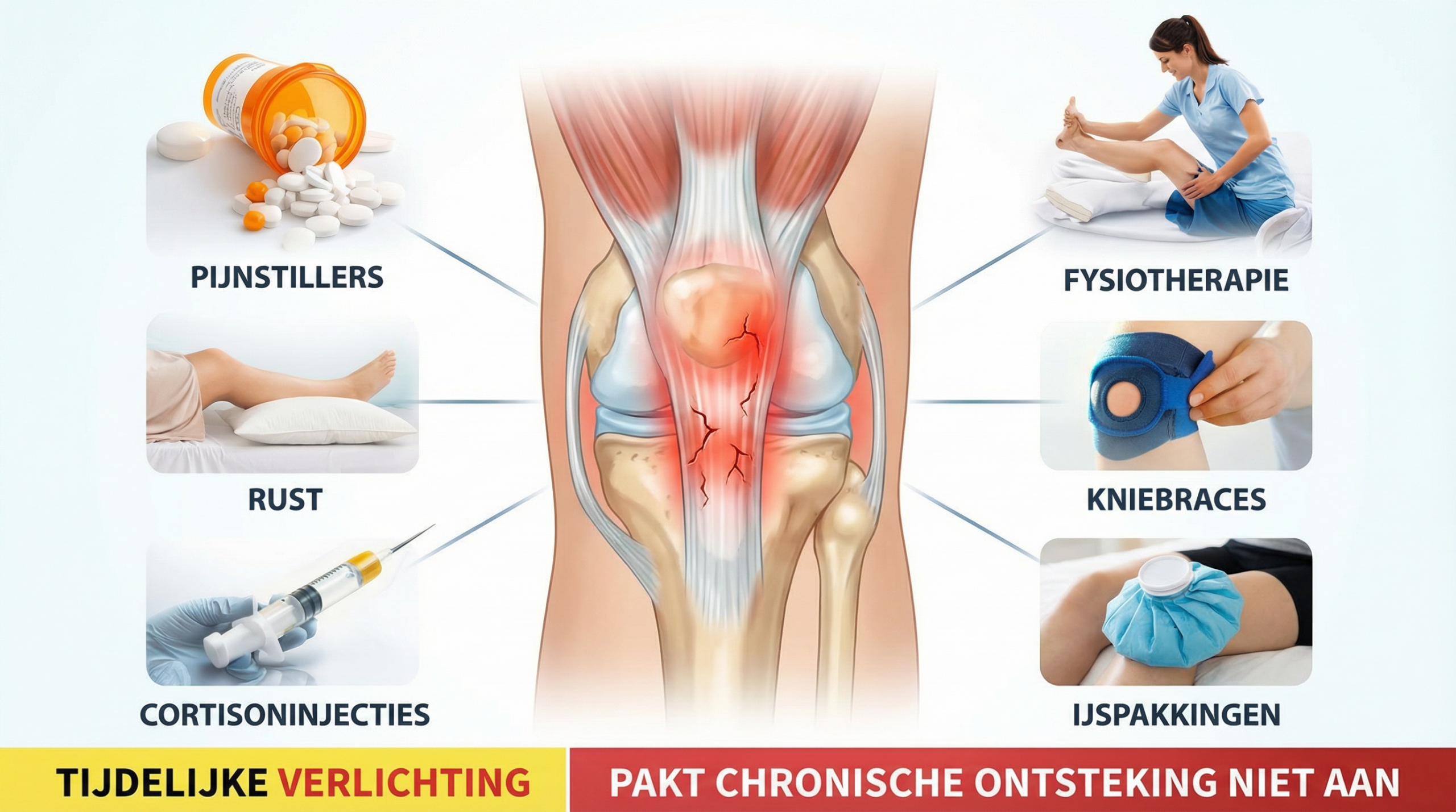 Kniebraces verlichten de druk tijdelijk, maar pakken de chronische ontsteking van binnenuit NIET aan