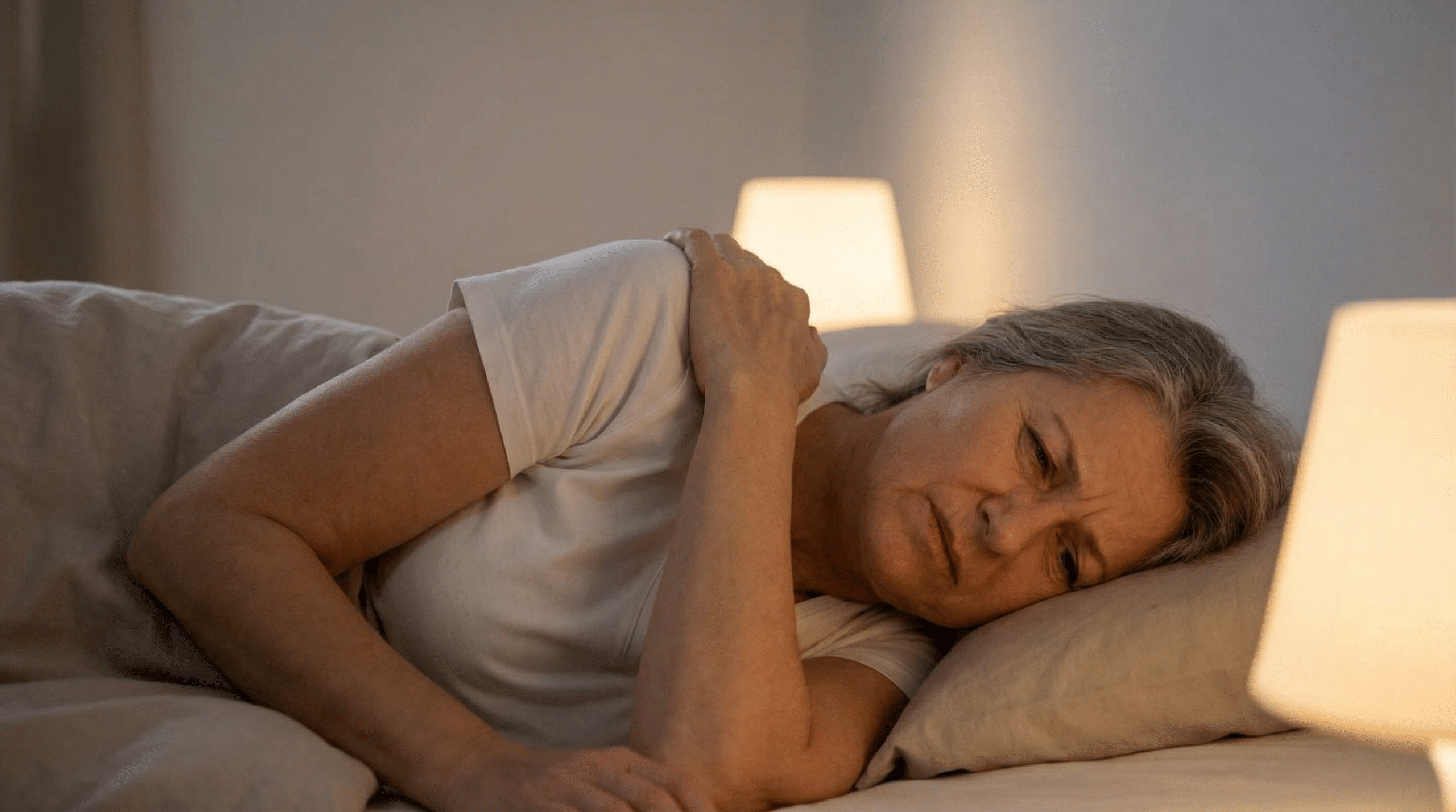 De ontsteking wordt erger bij elke beweging boven schouderhoogte, en zelfs 's nachts in bed vind je geen comfortabele houding. Je schouder voelt gezwollen en warm aan, en de pijn in je bovenarm en schouder houdt je uren wakker — precies wanneer je lichaam zou moeten herstellen.