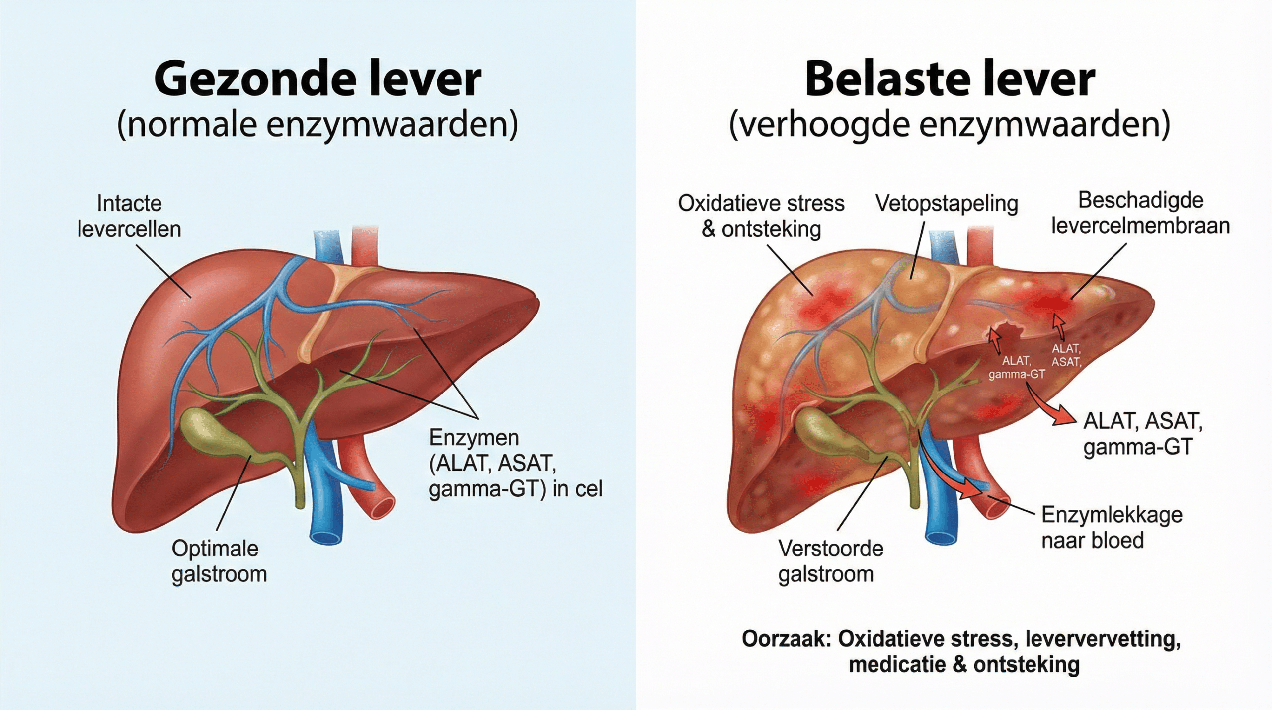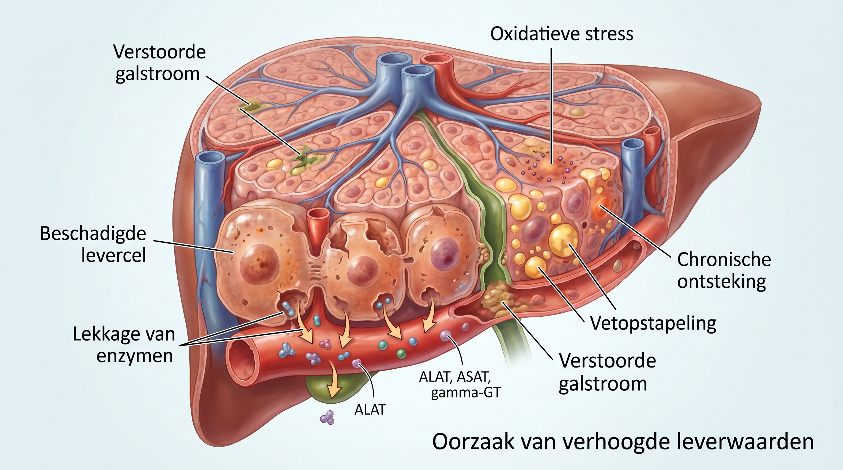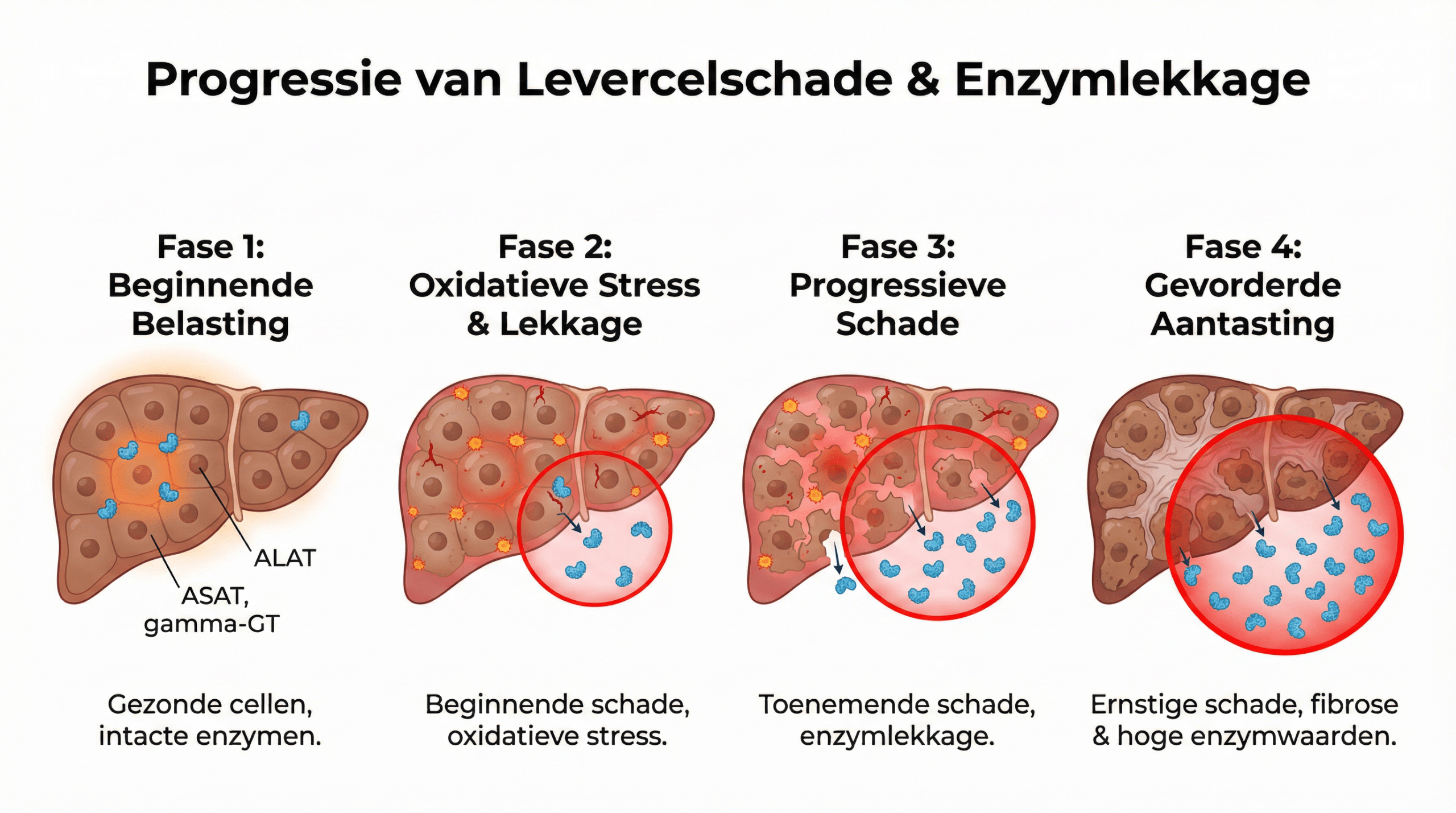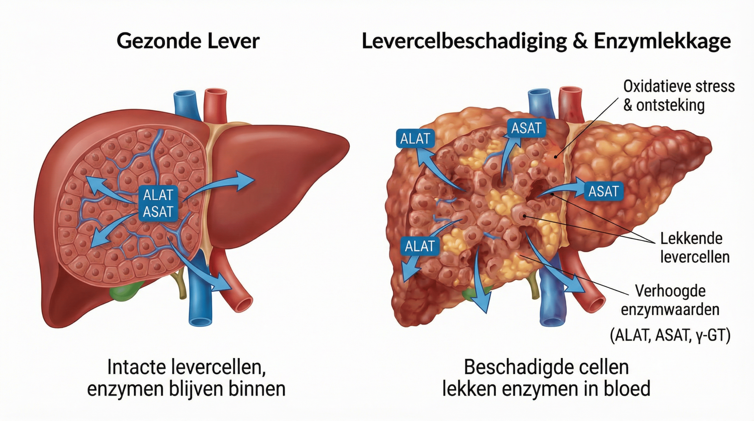 Wat normaal veilig binnenblijft in de cel, sijpelt naar buiten — en de stijging in je bloedonderzoek is de directe weerspiegeling van levercellen die op dat moment actief beschadigd worden.