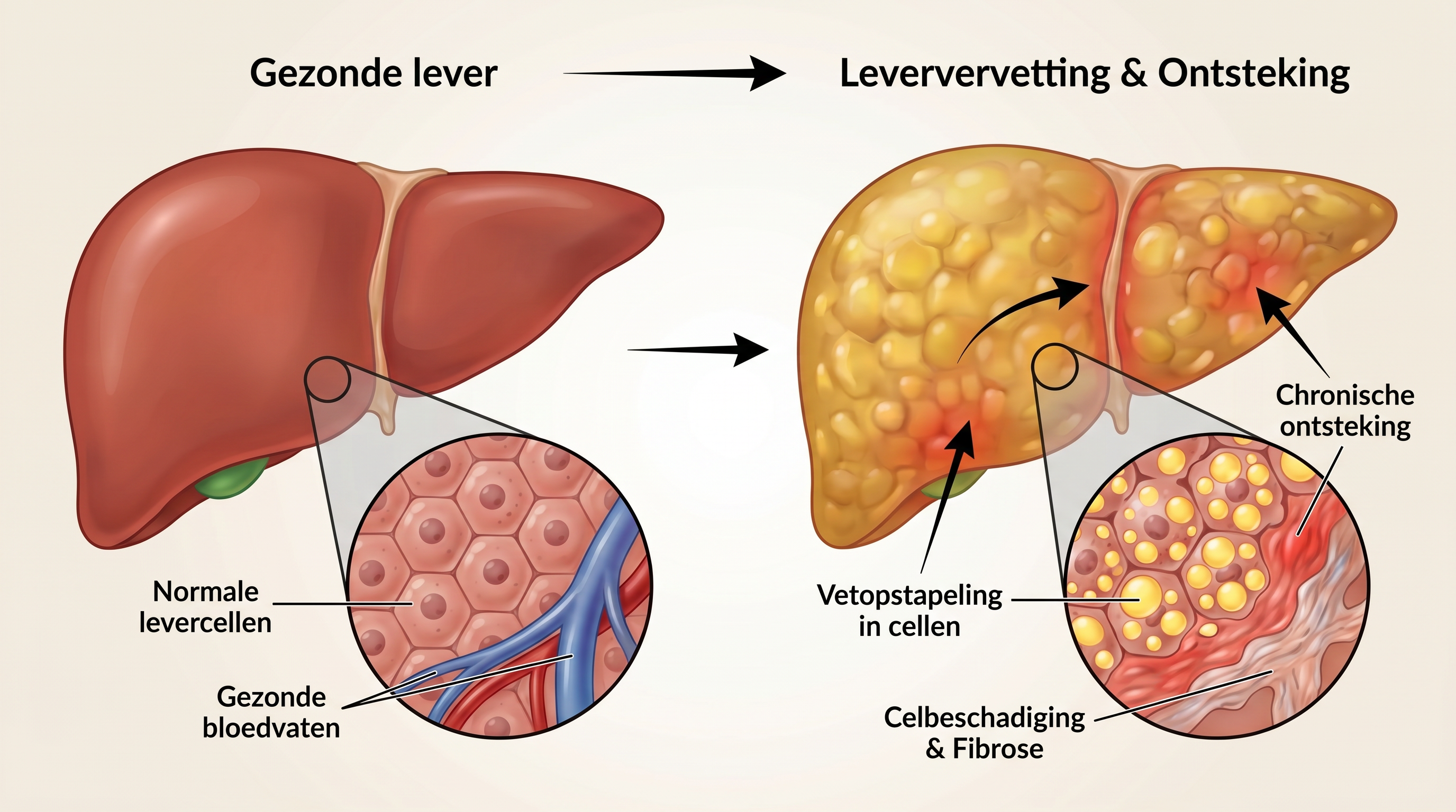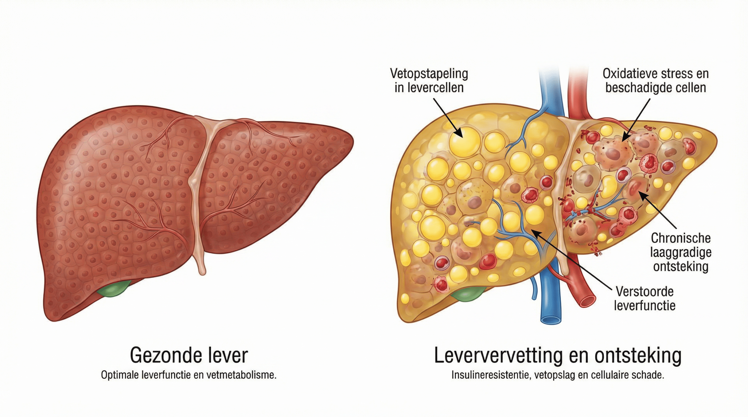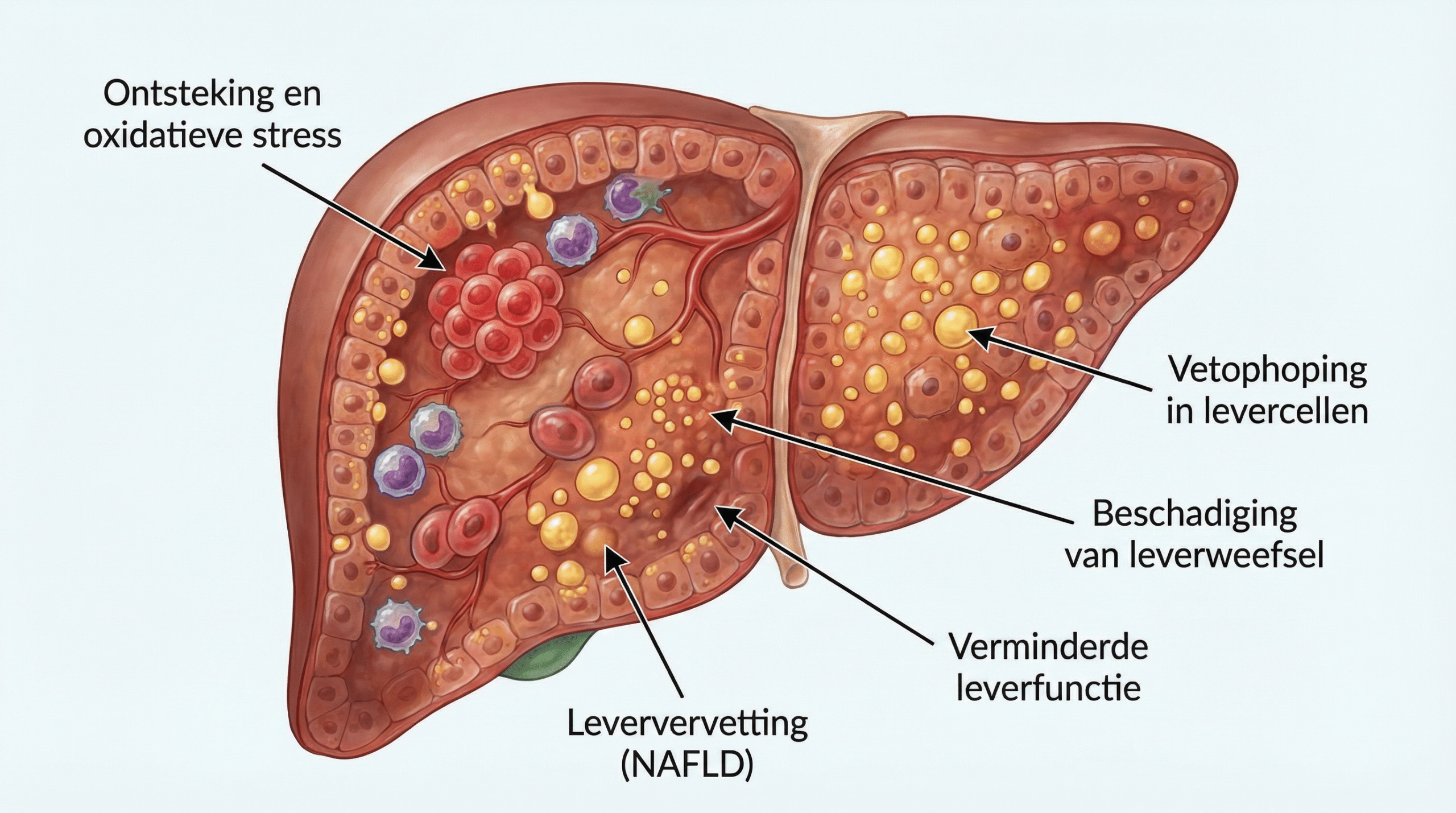 De giftige tussenproducten van fase 1 hopen zich op in het leverweefsel, veroorzaken oxidatieve stress en beschadigen levercellen van binnenuit — terwijl de lever steeds minder efficiënt wordt in het verwerken van nieuwe toxines.
