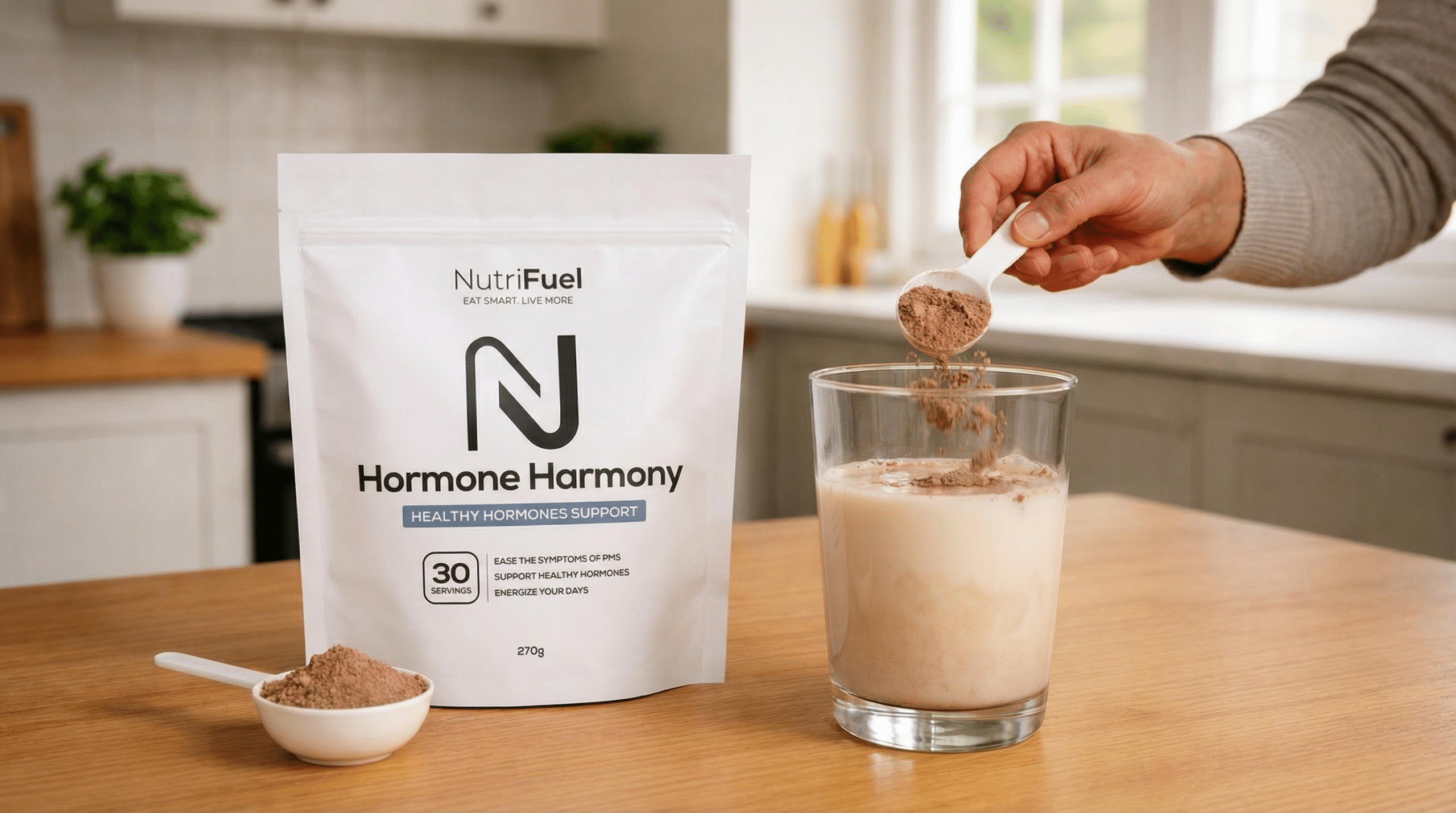 Nutrifuel Hormone Harmony heeft een warme, romige chocoladesmaak met een subtiele cacaobasis — aangenaam en goed te combineren met plantaardige melk.