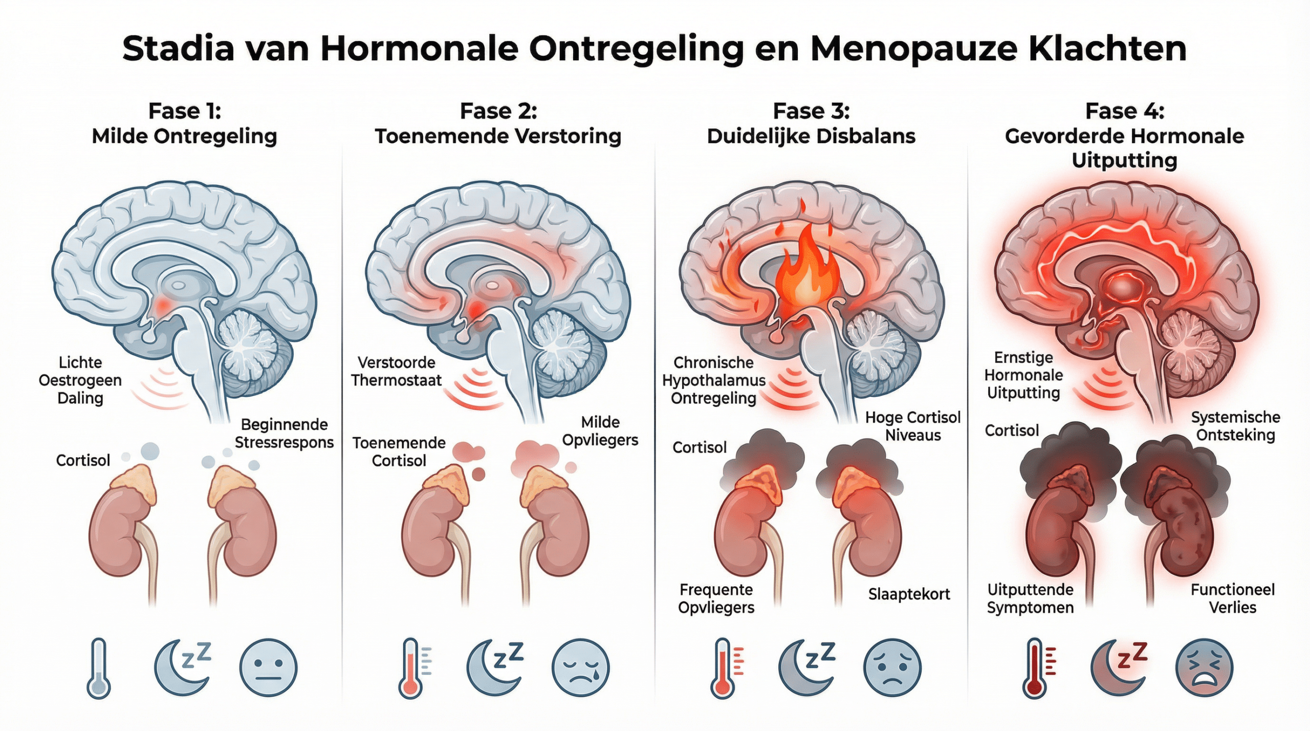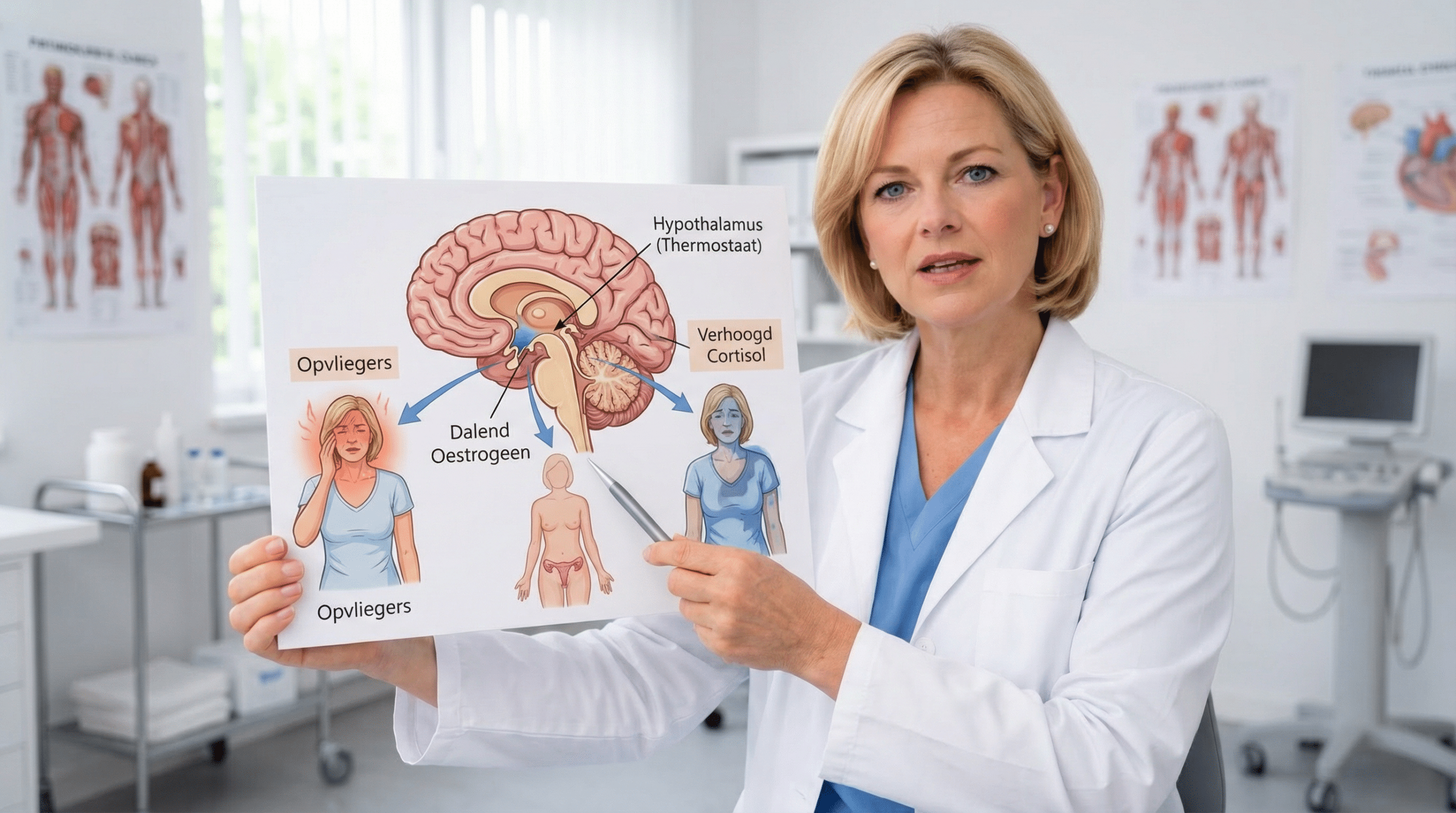 Oestrogeendaling is de trigger — maar de ernst van de klachten wordt sterk bepaald door de gevoeligheid van de hypothalamus en het niveau van cortisol in het systeem.