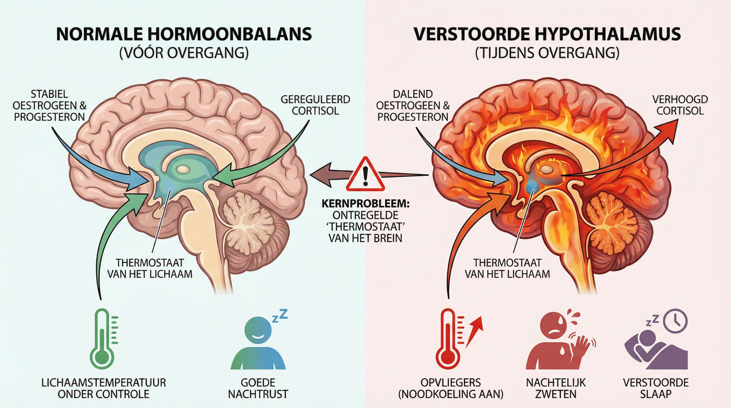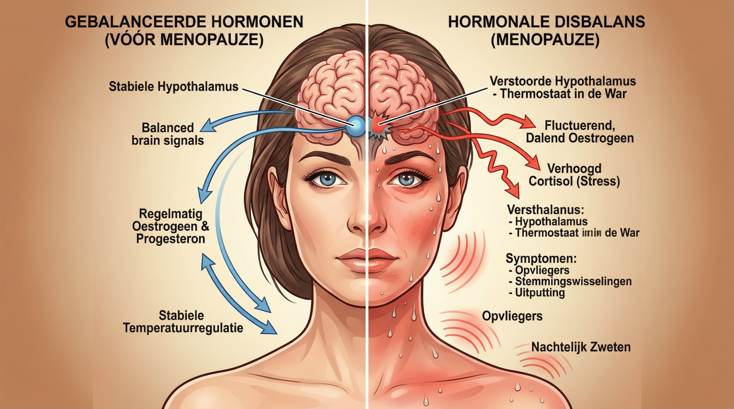 De overgang is geen ziekte — het is een hormonale overgang die het lichaam door de jaren heen voorbereidt op een nieuwe levensfase. Maar wanneer oestrogeen snel daalt, raakt de hypothalamus in de war. De hypothalamus is de "thermostaat" van het lichaam en was gewend aan stabiele oestrogeensignalen om de lichaamstemperatuur te reguleren. Zonder die signalen interpreteert hij kleine temperatuurstijgingen als gevaarlijk — en activeert hij een noodkoeling: de opvlieger.