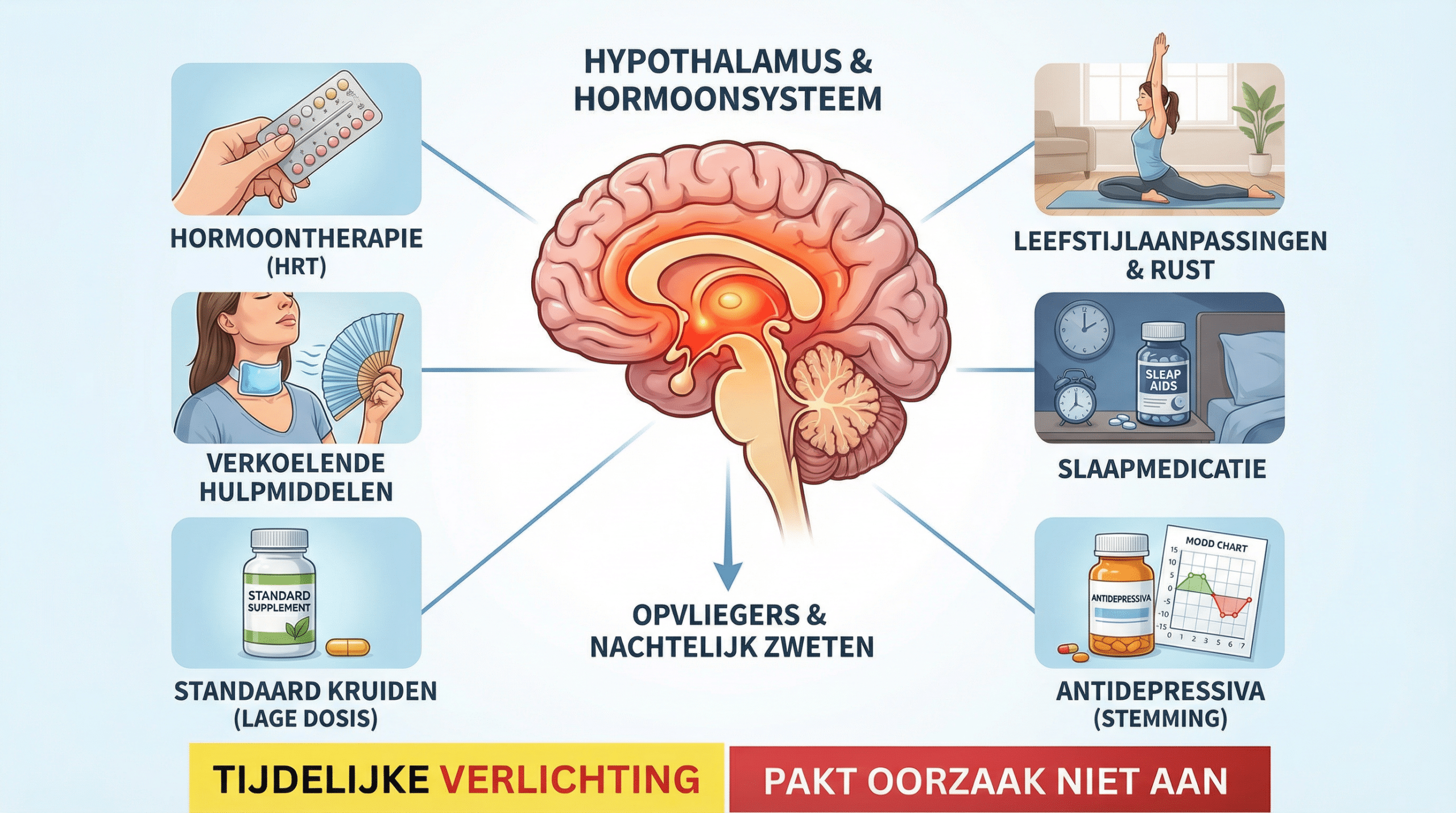Maar wist je dat een ontregelde hypothalamus — het thermostaat-centrum van het brein — een even beslissende rol speelt bij opvliegers en overgangsklachten als het oestrogeen zelf?